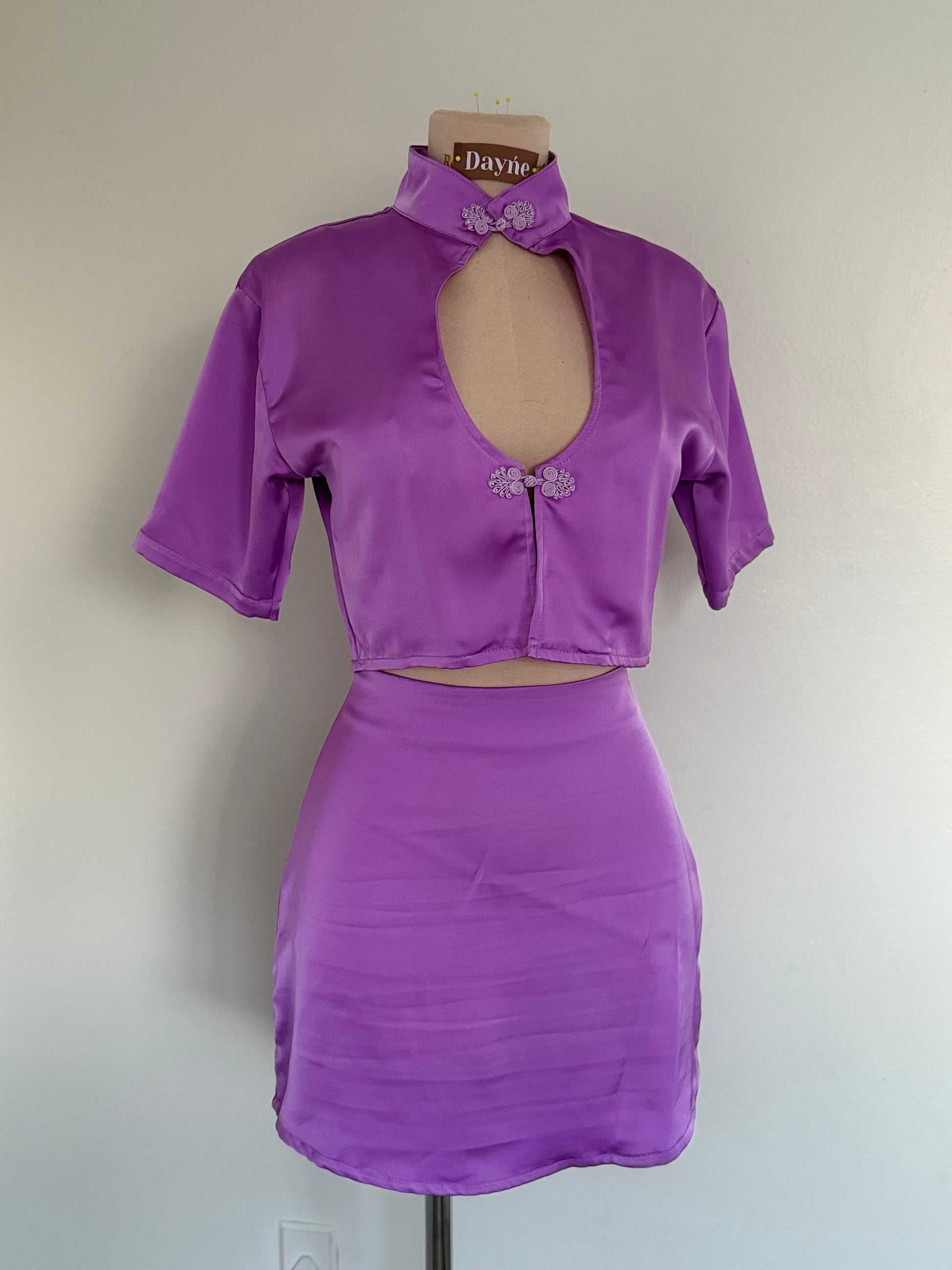 A bold fusion of elegance and edge. The Meraki Set features a satin stretch fabric that hugs your curves with comfort. Designed with a high mandarin collar, statement frog closures, and a daring front cutout, this two-piece look blends Eastern-inspired detail with modern femininity.
